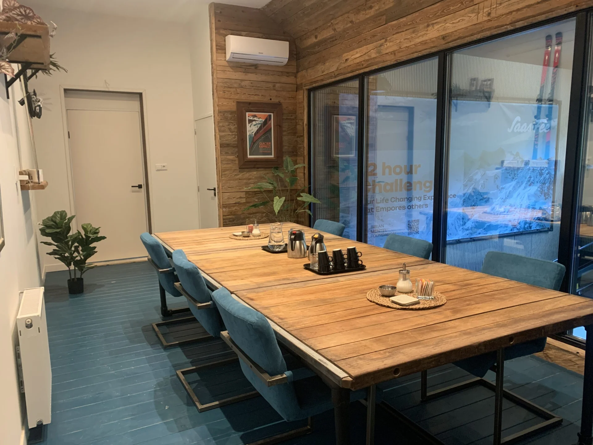 De vergaderruimte is op de bovenverdieping en heeft zicht op onze indoor skibaan “Zuid Helling”. De ruimte is warm en sfeervol ingericht met een grote tafel van oude steenschotten en heerlijk zittende stoelen. Daarnaast is er razendsnelle wifi, een tv en flipover beschikbaar.